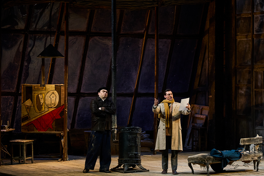 Marcello and Rodolfo, trying to work, are discussing their lives. Rodolfo has seen Musetta in a fine carriage; Marcello has seen Mimì dressed like a queen. Rodolfo takes out Mimì’s bonnet and Marcello pulls some of Musetta’s ribbons from his pocket; they both indulge in a nostalgic recollection of times past.