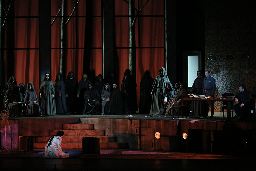 Scene two. The guests continue to celebrate the wedding. Raymond breaks up the festivities with terrible news: Lucia has gone mad and stabbed Arthur to death. The crazed Lucia, her nightgown stained with blood, appears in the hall. She thinks that she is once more in the garden, on the way to meet her beloved Edgar. However, her happiness quickly turns into horror as she sees the ghost. Lucia begs Edgar to hide and leads him to the altar decorated with roses. She sees a church, where she is married to Edgar, not Arthur. Lucia collapses.