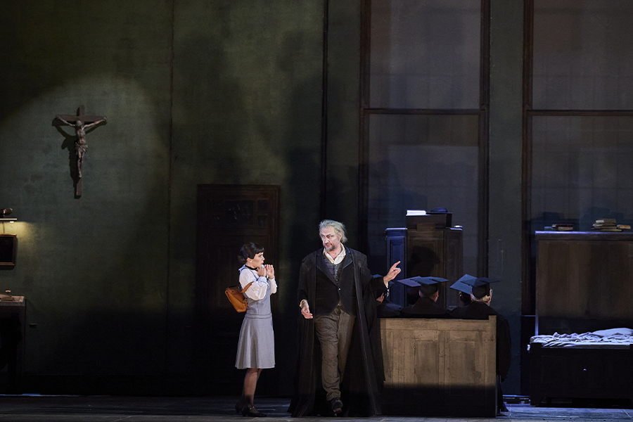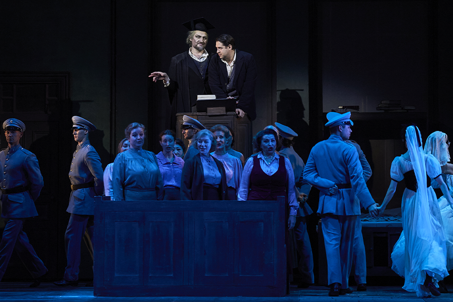 The tragic story of the love between Faust and Marguerite in the Mariinsky Theatre’s production has been moved to the outset of the 20th century, though the director makes us understand: it is a story that repeats itself over and over. the protagonists wander among tombstones on which they may read their own names and dates from different centuries. Within the context of modern-day morality, when the old concepts of honour and dishonour or guilt and innocence have been reassessed, Bywater shows Faust’s sinfulness, comparing him to Nabokov’s Humbert and Marguerite to Lolita. the opera’s heroine is fourteen years of age, and her seducer is an old man who has re-acquired only his physical youthfulness. For Faust, the object of his affections is also initially simply the “nymphet” Gretchen, one of numerous schoolgirls with a satchel, a flower that there is an irresistible urge to pluck. Once plucked, this is a flower that turns out to be of no use to any man: neither to her lover nor to her brother. To depict this idea more clearly, Bywater has made Siébel, the only male character who is sympathetic to Marguerite, into a young woman.