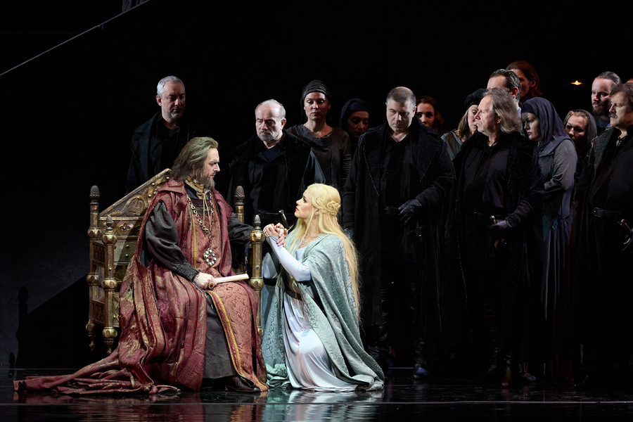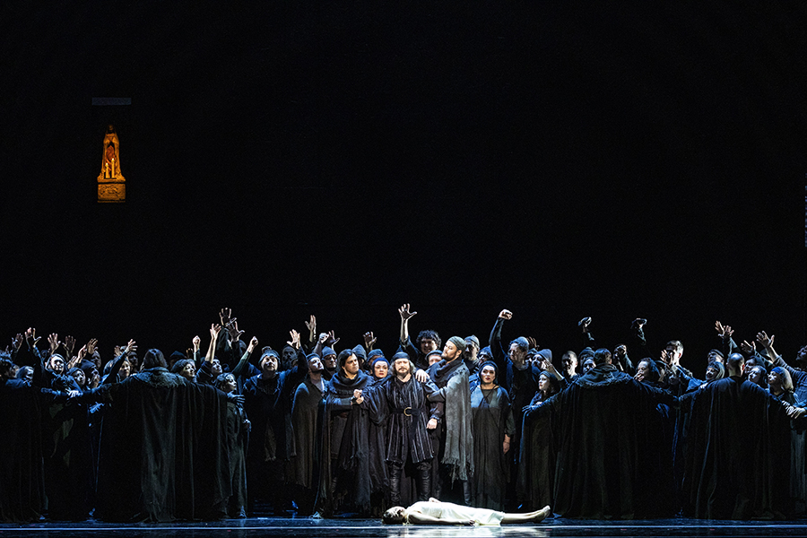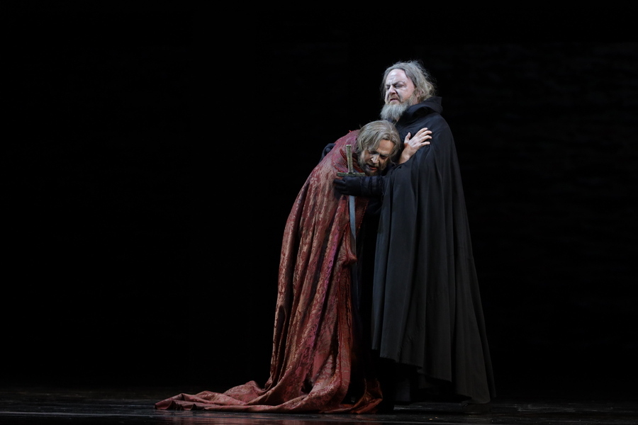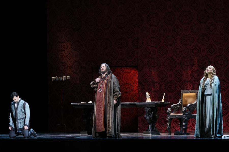 Постановка Андреа Де Розы была перенесена в Мариинский из итальянских театров Карло Феличе (Генуя) и Ла Фениче (Венеция). Она сочетает в себе исторические костюмы и минимальное сценическое оформление: добрую часть сцены занимает постоянно меняющаяся черная стена, в которой то открываются двери, то появляются ренессансные венецианские окна, то она обнажается до своей решетчатой структуры. Намеренная условность пространства позволяет высветить оттенки актерской игры, сфокусироваться на сложных взаимоотношениях персонажей. На протяжении всего спектакля на задник сцены проецируется видео с удивительной красоты видами Лигурийского моря, что сопровождают действие и откликаются на него переменой света. Водная гладь здесь выступает тем горизонтом, к которому внутренне устремлен Симон Бокканегра, символом свободы и чистоты его души. Денис Великжанин