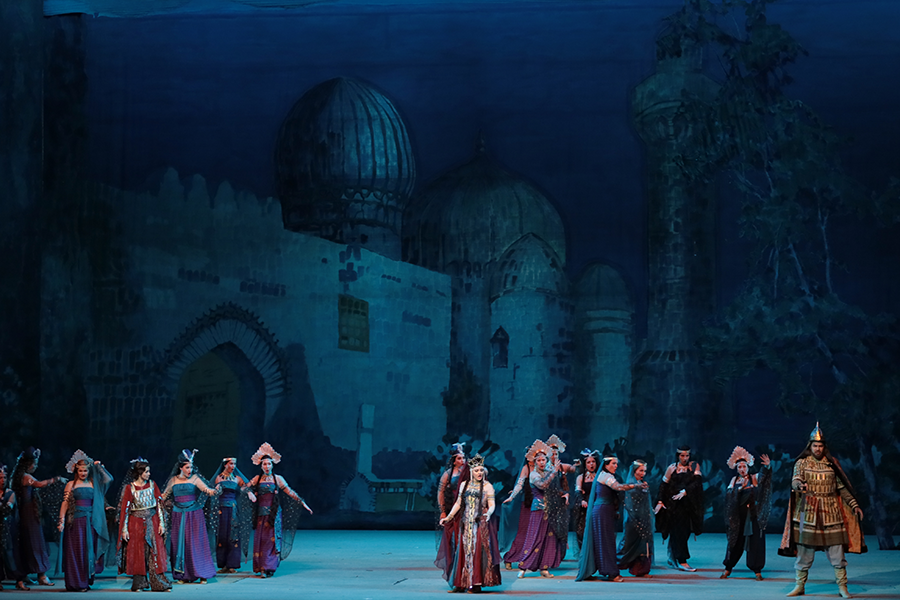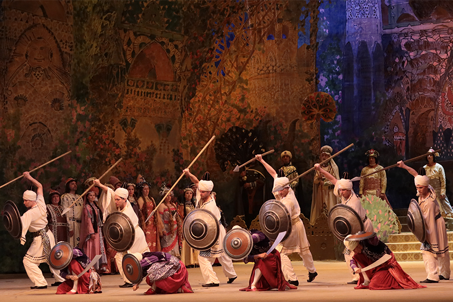 Слова Одоевского о «Руслане и Людмиле» можно отнести и к постановке этой оперы в Мариинском театре. Бельгиец Тьерри Боске месяцами работал в художественных мастерских театра, лично искал ткани для костюмов в магазинах по всему миру, стремясь спустя девяносто лет воспроизвести умопомрачительные краски и орнаменты легендарного спектакля 1904 года. Тогда, в год столетнего юбилея Глинки, над оформлением «Руслана» работали Константин Коровин и Александр Головин. Пышный русско-византийский модерн их сценографии поражает и сегодня, как в целом, так и в деталях, рассматривать которые – отдельное удовольствие. Картины оперы сменяют друг друга, словно страницы гигантской иллюстрированной книги сказок. Отдельного упоминания заслуживают танцы; они воскрешают другой юбилейный спектакль, 1917 года, когда в Мариинском театре праздновали 75-летие со дня первого представления «Руслана и Людмилы». Он шел в знакомых декорациях, но с новыми танцами Михаила Фокина. Ускользнувший от либреттистов пушкинский юмор вернулся в поставленных Фокиным танцах и шествиях, особенно – в кульминационном Марше Черномора.