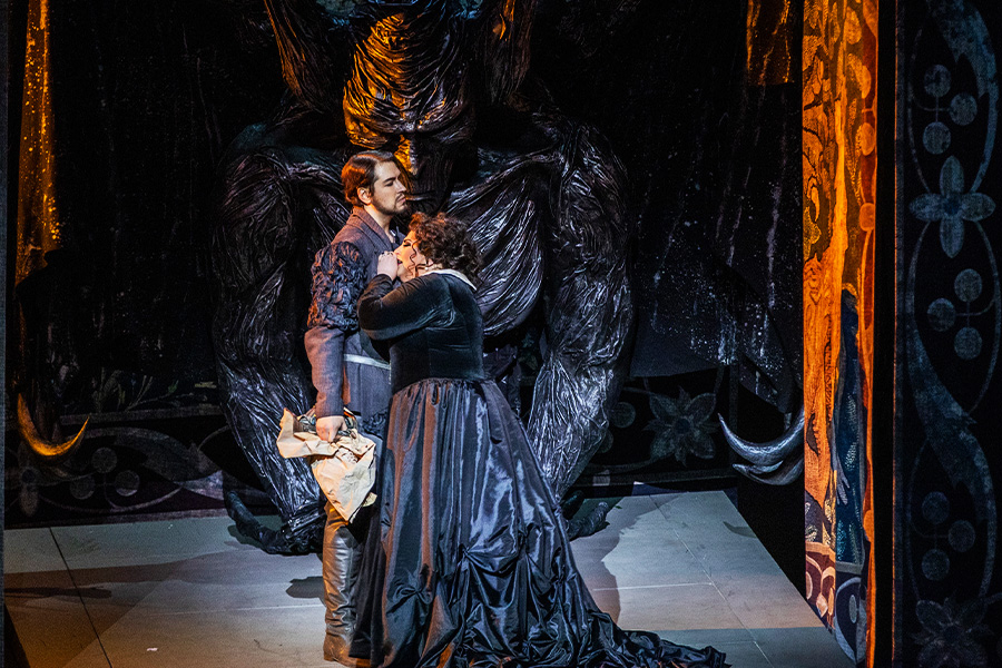 Вскоре появляется и сам Рауль. Подают вино. Заметив мечтательный вид юноши, хозяин замка хочет выведать его сердечную тайну. Рауль поддается на уговоры и рассказывает, как несколько дней назад в одну из своих прогулок спас неизвестную ему прекрасную девушку от назойливых приставаний пьяной студенческой компании. Очарованный юной незнакомкой, он полюбил ее.